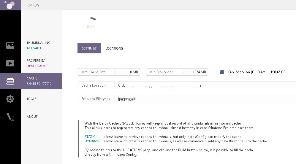 L’onglet suivant est cache , et c’est qu’Icaros crée son propre cache de vignettes pour les avoir disponibles quand elles doivent être affichées dans l’explorateur de fichiers. De plus, il vous permet d’attribuer un dossier de cache Icaros et de définir sa capacité maximale. Si on veut qu’il soit illimité, il faut fixer la taille maximale du cache à 0. Pour supprimer ce cache, il faut aller dans l’onglet outils, qui est celui qui offre la possibilité de supprimer le cache de toutes les vignettes créées par Icaros. Vous pouvez télécharger l’application à partir de ce même lien pour libre .