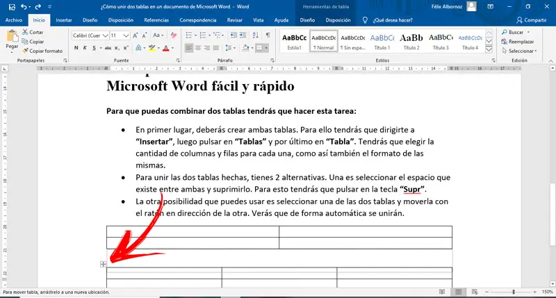 - Pour joindre les deux tables créées, vous avez 2 alternatives. La première consiste à sélectionner l’espace entre les deux et à le supprimer. Pour cela, vous devrez appuyer sur la touche «Suppr» .