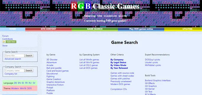 Parmi la vaste gamme de jeux RVB classiques , on retrouvera un bon nombre de titres du système d’exploitation DOS, d’autres inédits inédits ou encore des plus «modernes». Il s’agit d’un site créé pour la préservation des jeux classiques des systèmes d’exploitation PC expirés: DOS, OS / 2 , Win16 ou Win9x , entre autres. Ils ont été modifiés pour faciliter leur utilisation sur les systèmes les plus modernes et nous disposons d’un puissant moteur de recherche par système, genre , société de développement, etc.