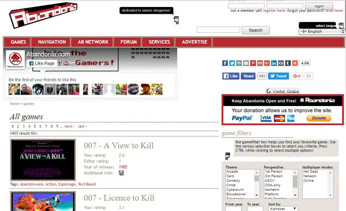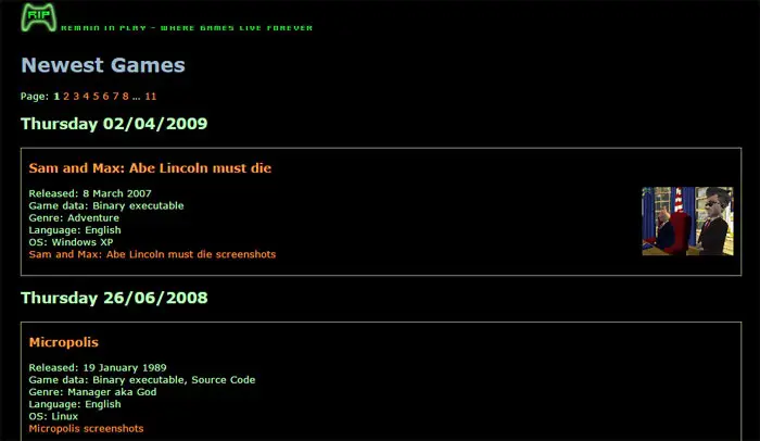 Ceci est un autre site abandonware axé de manière similaire sur les jeux DOS . Il a également un bon répertoire de titres bien qu’il lui manque des versions plus «récentes». Chacun des jeux exposés est livré avec sa catégorie , sa licence , sa date de sortie, des captures d’écran ou une vidéo avec quelques fragments.