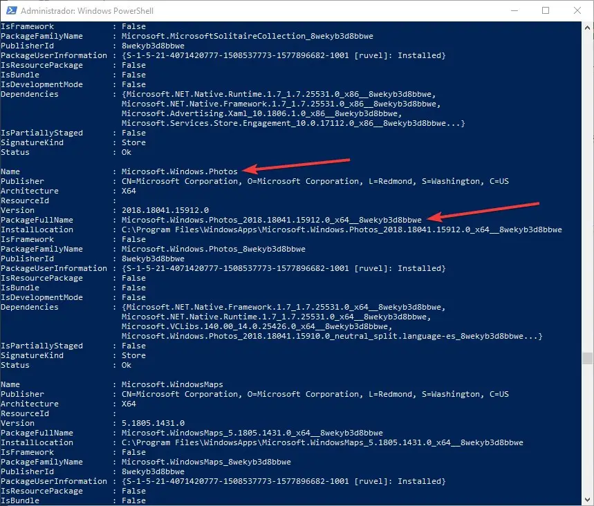 Para ello, abriremos una ventana de PowerShell con permisos de administrador y ejecutaremos el siguiente comando, el cual nos permitirá recuperar el nombre del paquete de la app Fotos, para poder reinstalarla.