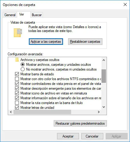 Si ce n’est pas le problème ou si nous ne voyons toujours pas la corbeille avec cette case cochée, nous pouvons en créer une nouvelle . Pour ce faire, la première chose que nous devons faire est d’ ouvrir l’explorateur de fichiers et de la View option de menu , affichez l’onglet qui apparaît sous les options pour sélectionner le dossier Modifier et options de recherche options . Dans la fenêtre ci-dessous, nous allons dans l’onglet Affichage et dans les options de configuration avancées, nous marquons les options Afficher les fichiers, les dossiers et lecteurs cachés et Afficher les fichiers protégés du système d’exploitation (recommandé).