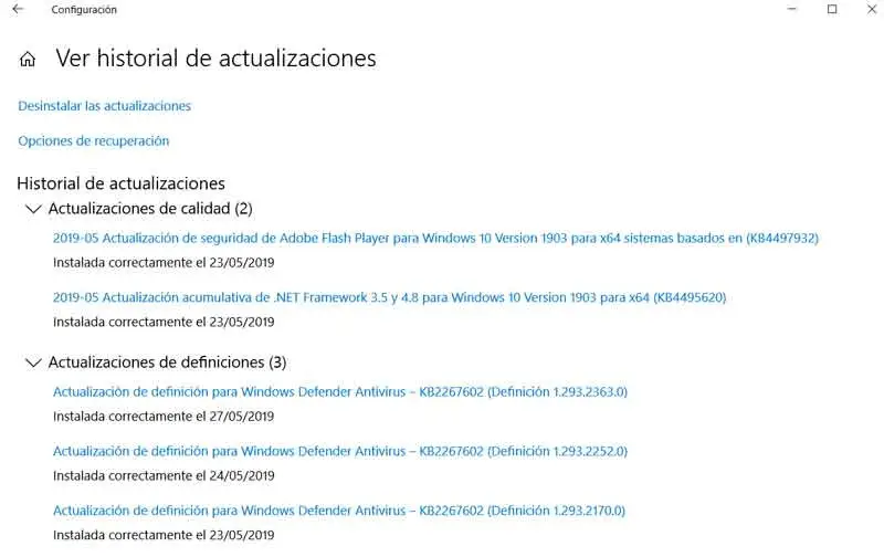 En raison de tout cela et en attendant une solution définitive de Redmond, la meilleure chose à faire si nécessaire est de désinstaller la mise à jour cumulative KB4497936 du système d’exploitation . C’est quelque chose que nous pouvons effectuer à partir de la fonction Paramètres de Windows 10 , en particulier à partir de la section «Mise à jour et sécurité / Windows Update / Afficher l’historique des mises à jour / Désinstaller les mises à jour».