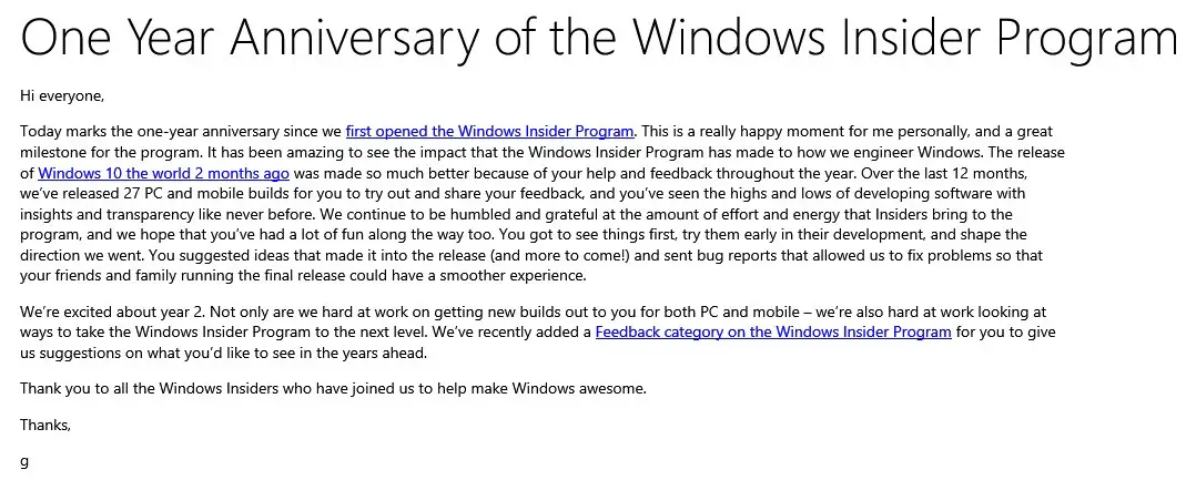 Gabe Aul lui-même, l’un des responsables du programme Insider, a clairement expliqué ce que cela signifie pour Microsoft: «Vous avez vu les hauts et les bas du développement de Windows 10 avec une transparence jamais vue auparavant. Nous continuons d’être reconnaissants pour la quantité d’efforts et d’énergie que les testeurs apportent au programme, et nous espérons que vous vous êtes bien amusé ces derniers mois.Vous voyez les choses avant tout le monde, et vous les testez quand elles ne sont pas encore bien développées , contribuant à façonner les différentes fonctionnalités. Vous suggérez également des idées pour la prochaine version et soumettez des rapports de bogue qui nous permettent de résoudre les problèmes afin que vos amis et votre famille exécutant la version finale puissent avoir une expérience plus fluide. «