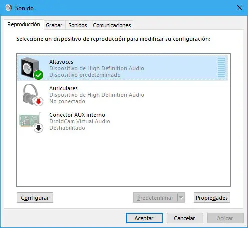 Si après cela nous n’avons pas résolu le problème, nous devons nous assurer que notre appareil par défaut est configuré sous Windows 10. Nous cliquons avec le bouton droit de la souris sur l’icône du haut-parleur système et sélectionnons Sons . Dans la fenêtre qui s’ouvre, nous allons dans l’onglet Lecture et vérifions que le périphérique audio de notre ordinateur est défini par défaut et configuré. Nous pouvons faire la même chose dans l’onglet Enregistrement avec les appareils d’enregistrement ou le microphone.