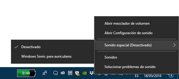 Une autre chose à faire si le son ne fonctionne pas dans la mise à jour Windows 10 avril 2018 est de désactiver le son spatial . Pour ce faire, cliquez avec le bouton droit de la souris sur l’icône du haut-parleur dans la barre d’état système et sélectionnez l’option Spatial Sound> Off.