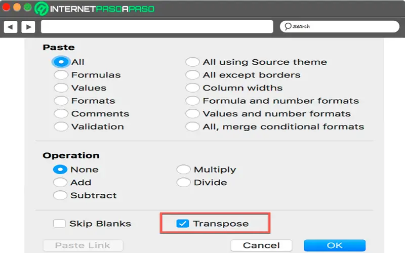 - Si vous souhaitez appliquer une mise en forme supplémentaire à la feuille, vous pouvez sélectionner l’option «Collage spécial» dans le menu «Coller» . Pour ce faire, une fenêtre s’ouvrira dans laquelle vous pourrez sélectionner toutes les options de formatage. Cliquez ensuite sur l’option «Transposer» et une fois terminé, sélectionnez «OK».