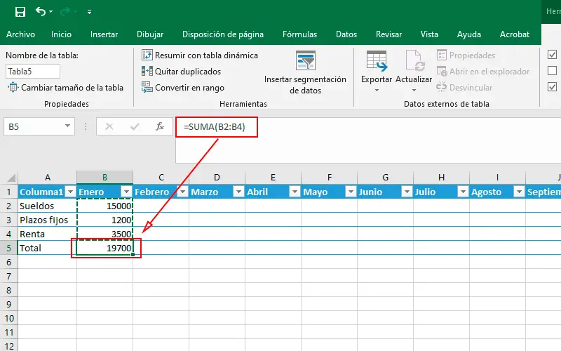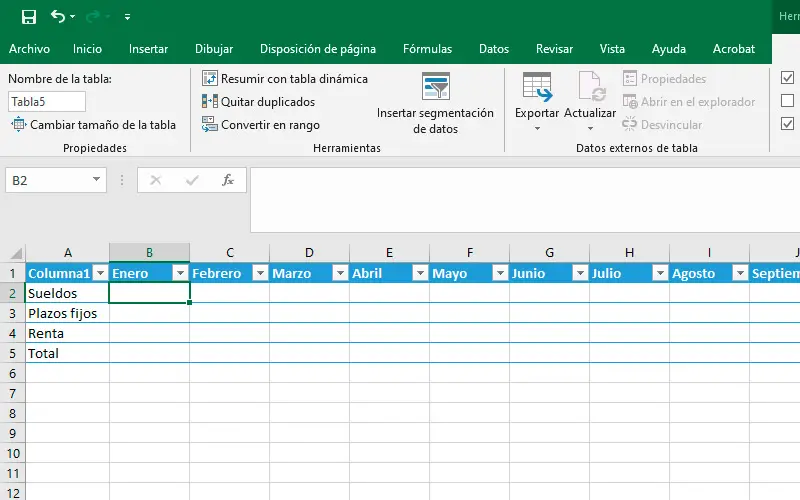 Nous y placerons tout l’argent que nous recevons chaque mois en fonction de sa provenance. Par exemple, les salaires, les durées fixes, le loyer, etc. Comme auparavant, écrivez les mois de l’année.