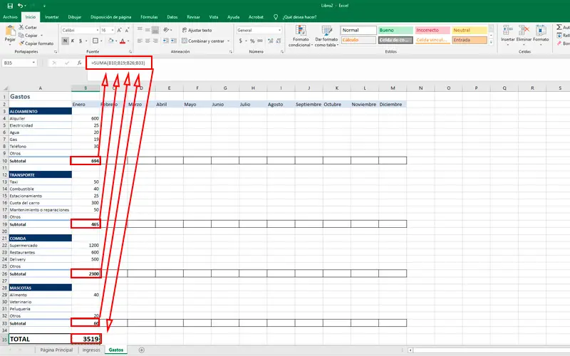- En bas, placez le total , qui sera composé de la somme de tous les sous-totaux . Pour ce faire, entrez «= SUM ()» mais cette fois, au lieu de faire glisser, vous sélectionnerez chacun d’eux tout en maintenant la touche «Ctrl» enfoncée . Dans l’exemple, il reste «= SUM (B10; B19; B26; B33)».