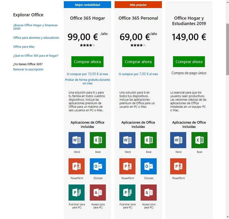 Récemment, Microsoft a commencé à parier sur un nouveau modèle de licence, Office 365 , un paiement d’abonnement que nous pouvons renouveler année après année, pouvant choisir entre payer 7 euros par mois (ou 69 euros par an), 10 euros par mois (99 euros par an) à partager avec jusqu’à 6 utilisateurs ou acheter la dernière version (en ce moment, Office 2019) pour un paiement unique de 149 euros.