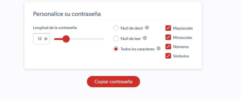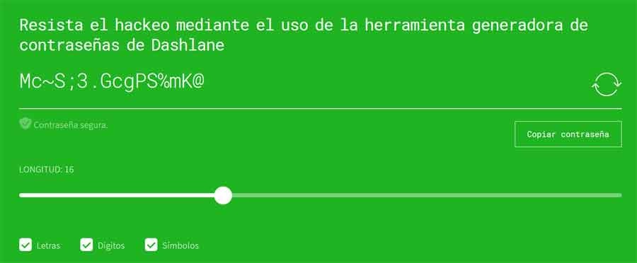 C’est le cas, par exemple, de la proposition Dashlane , un créateur de mots de passe fort qui se caractérise par sa simplicité d’utilisation. Ainsi, une fois que nous aurons accédé au site officiel de l’application, nous devrons personnaliser une série de paramètres qui seront pris en compte lors de la création, de manière automatisée, de la clé elle-même. De cette façon, il faut en préciser la longueur, ainsi que les types de caractères dont il pourra être composé: lettres, chiffres et symboles .