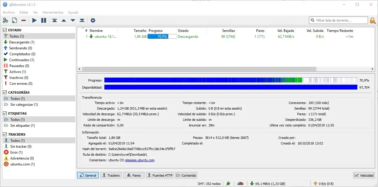 Pour télécharger des fichiers torrent à partir du réseau, nous avons simplement besoin de deux exigences: trouver le fichier sur Internet, soit via un lien «aimant», soit via un fichier «torrent», dans le grand nombre de sites de téléchargement de torrent qui existent, et ont dans notre ordinateur un client torrent qui nous permet de télécharger le fichier sur notre ordinateur.