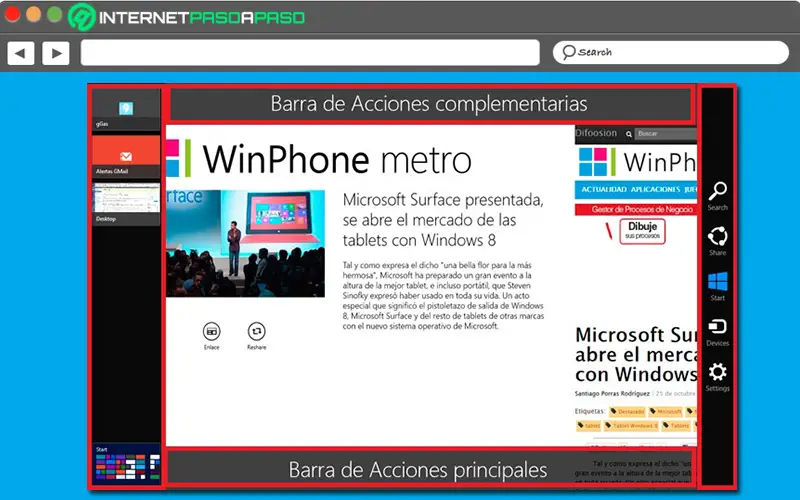 De cette façon, en haut , vous aurez différentes actions complémentaires à effectuer dans la vue dans laquelle vous vous trouvez au sein d’une application. Alors que, du bas, vous pouvez utiliser les actions principales. D’autre part, par le bord droit , vous trouvez des alternatives telles que: recherche, paramètres, démarrage, partage et appareils. De plus, sur le côté gauche , vous aurez un résumé de toutes les applications ouvertes à ce moment.
