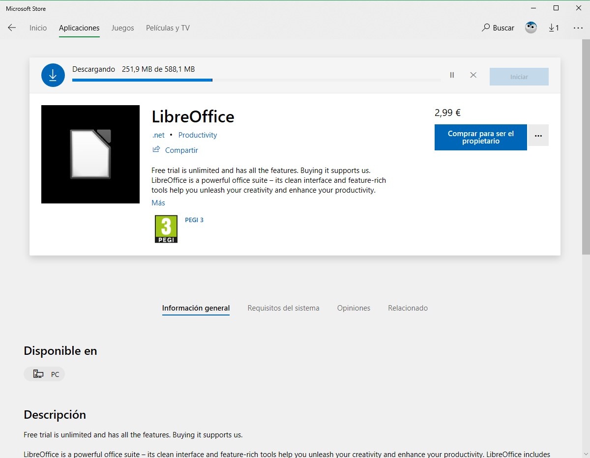 Apparemment, l’escroc qui s’est approprié cette application pour en profiter a utilisé Project Centennial (le projet de Microsoft de porter des applications Win32 au format UWP) pour pouvoir publier cette application dans la boutique d’applications Windows 10. Il semble que la suite bureautique soit légale , et a les mêmes applications que nous pouvons trouver dans la version légitime, en réalité nous ne pouvons pas garantir qu’elle ne cache pas un type de menace dans l’application elle-même, ou qu’à tout moment la version de «test» et ils nous facturent 3 euros (ou plus) pour continuer à utiliser cette application.