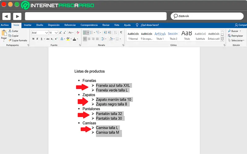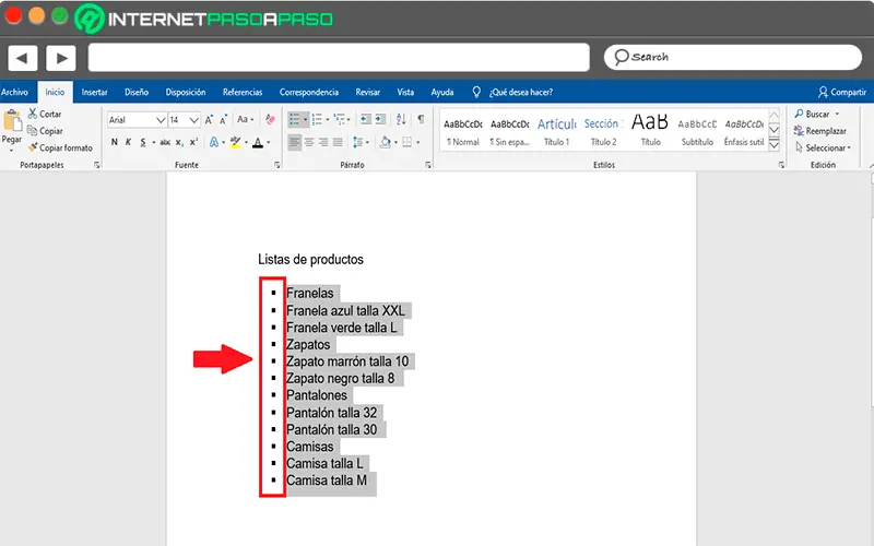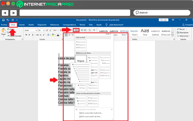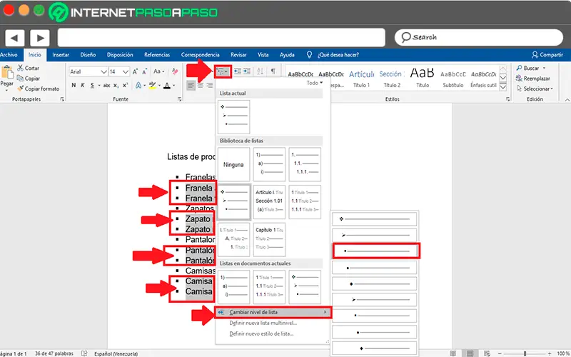 - Dans ce cas, vous devez sélectionner chacun des produits dans chaque catégorie, lorsque vous les avez sélectionnés vous devez revenir à l’ icône multiniveau et dans le menu déroulant sélectionner changer le niveau de la liste.