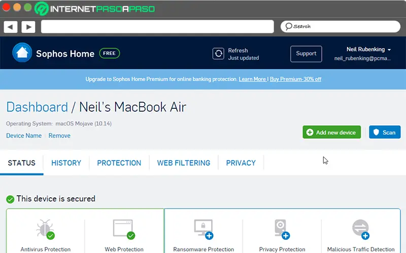 Avec un essai gratuit de 30 jours et un coût de 49,95 euros par an , ce logiciel est considéré comme l’une des meilleures solutions que les utilisateurs de Mac doivent installer sur leur ordinateur et éviter les risques. Depuis, il présente la capacité de détecter et de supprimer 100% des logiciels malveillants existants , avec peu de charge pour le système MacOS. De plus, il contient une protection contre le phishing et les logiciels espions , offre un gestionnaire de mots de passe, fournit un contrôle parental très efficace , garantit une haute sécurité dans les achats et les services bancaires en ligne et est même parfait pour une utilisation dans les environnements familiaux car il prend en charge 1, 3 et jusqu’à 5 équipes .