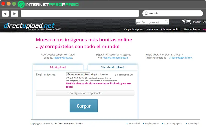 Bien qu’il ne vous permette de télécharger des fichiers image qu’aux formats JPG et JPEG , il est considéré comme l’une des plates-formes les plus recommandées pour héberger des images sur Internet de manière totalement gratuite. En ce sens, les avantages qu’il apporte à ses utilisateurs reposent sur le fait de bénéficier d’ une période d’hébergement de stockage illimitée , il offre une bande passante illimitée, aucune inscription n’est requise, la taille libre maximale est illimitée et la limite par fichier est jusqu’à 10 MB .