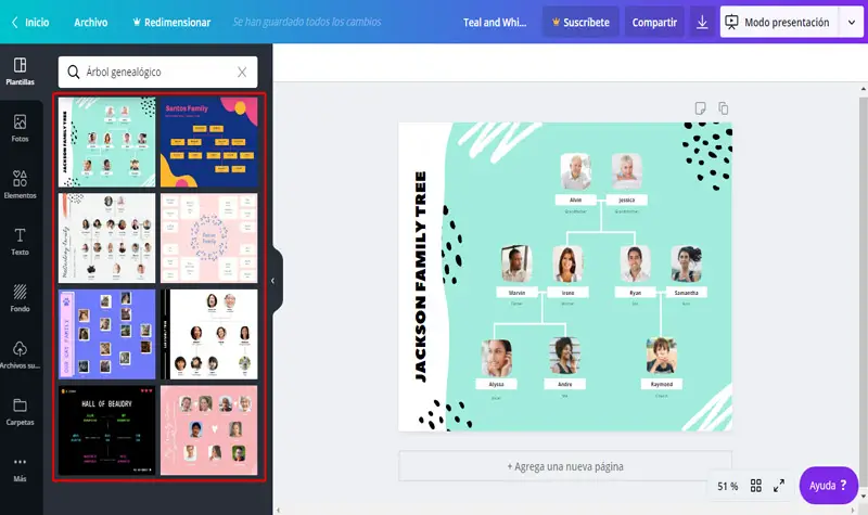 Dans Canva, nous pouvons trouver les meilleures feuilles de travail pour la création de notre organigramme familial , il nous montrera toutes les indications d’une manière très simple afin que nous puissions ajouter à chaque étape que nous faisons.