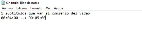 - La prochaine chose à faire est de saisir la période de temps souhaitée pour que la phrase soit lue sur la vidéo. Par exemple, si la première phrase du sous-titre doit apparaître dans les premières secondes du film ou de la série, alors nous mettons 00:04:00 à 00:05:00 et enfin appuyons sur la touche «Entrée».