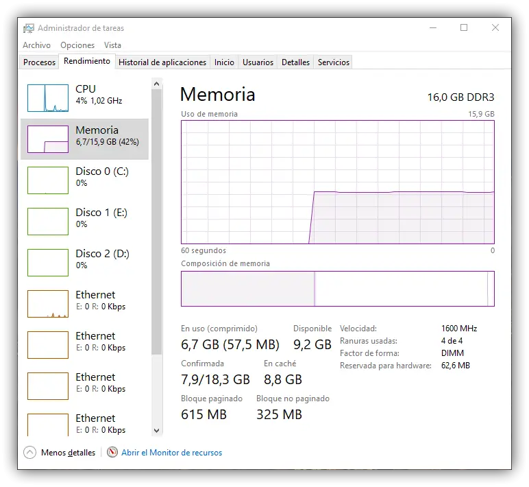 Nous ne devons pas non plus nous inquiéter d’avoir beaucoup d’espace occupé dans la RAM. Les dernières versions de Windows, en particulier depuis la mise à jour anniversaire de Windows 10, ne compressent pas les données dans la RAM tant que cela n’est pas nécessaire, les performances sont donc bien meilleures. Lorsque nous manquons de mémoire, le système d’exploitation décide s’il est préférable de compresser les données pour économiser de l’espace ou de déplacer les informations plus volumineuses, si ce ne sont pas des ressources critiques, vers la mémoire virtuelle.