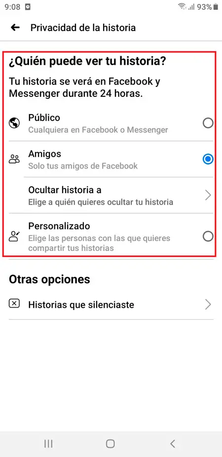 - Une fois que vous avez cliqué dessus, différentes options apparaîtront, ici vous pouvez sélectionner si vos histoires vous voulez être «Publiques», «Amis», «Masquer les histoires de» ou «Personnalisées», cela vous permettra de choisir entre quels utilisateurs peuvent voir vos différentes histoires lesquels ne le font pas, un moyen de les rendre beaucoup plus privés.