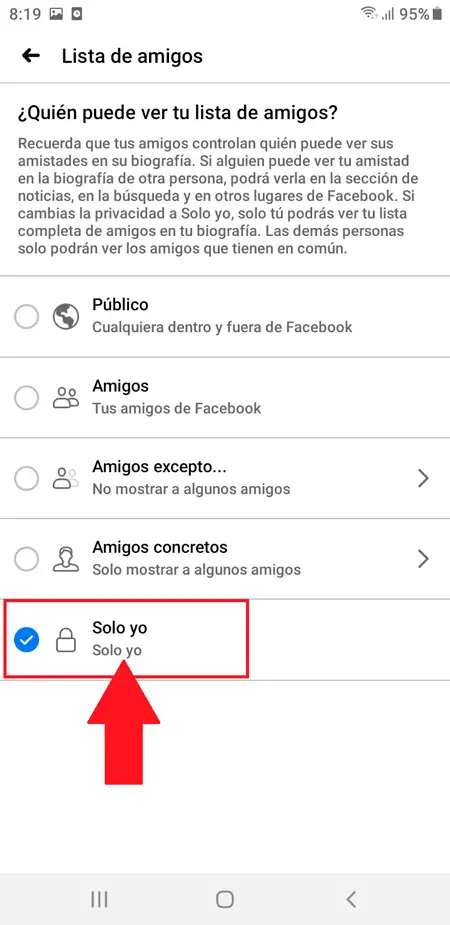 - En cliquant sur cette option vous trouverez plusieurs options, dans ce cas «Public», «Amis», «Amis sauf», «Amis spécifiques», «Seulement moi», le plus recommandé dans ce cas est de choisir l’élément «Seulement moi «De cette façon, personne ne peut accéder à votre liste d’amis.