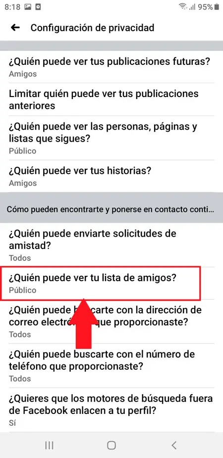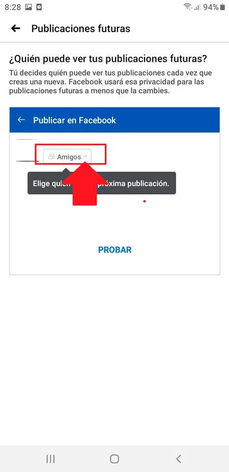 - Dans ce cas, nous entrons dans le premier, une nouvelle page s’ouvrira où vous pourrez sélectionner qui peut voir toutes vos futures publications, par défaut il y a l’élément «Amis» sélectionné, ici il vous suffit de faire défiler le menu d’options et de choisir l’option qui vous convient le mieux.
