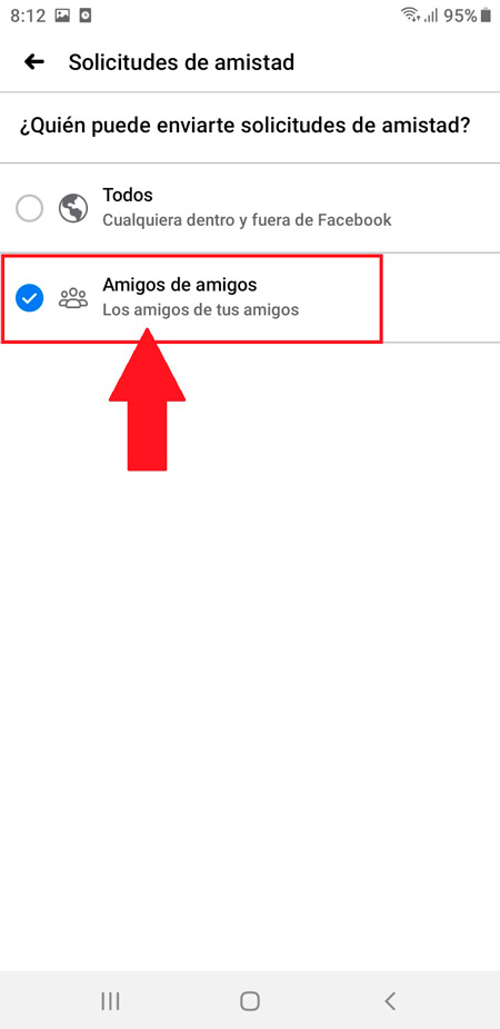 - Dans la nouvelle page qui apparaît, vous trouverez deux options, «Tous» ou «Amis des amis», dans ce cas sélectionnez «Amis des amis» pour que cette option soit beaucoup plus limitée dans votre profil.
