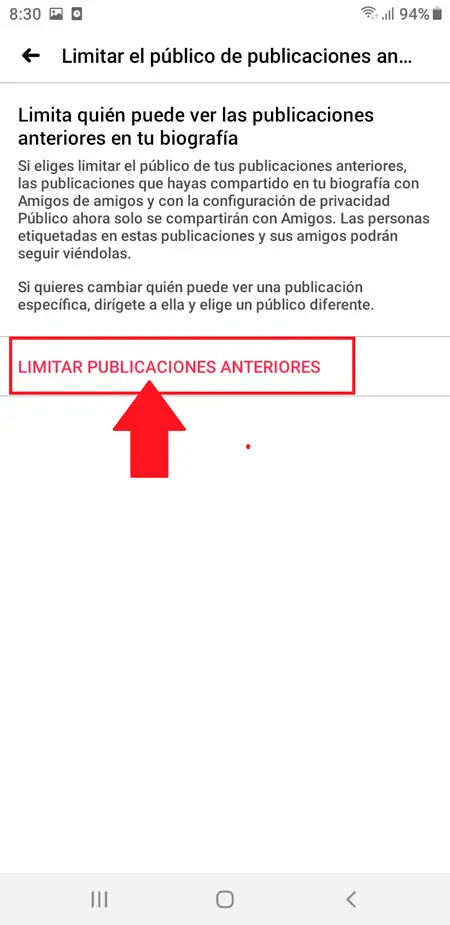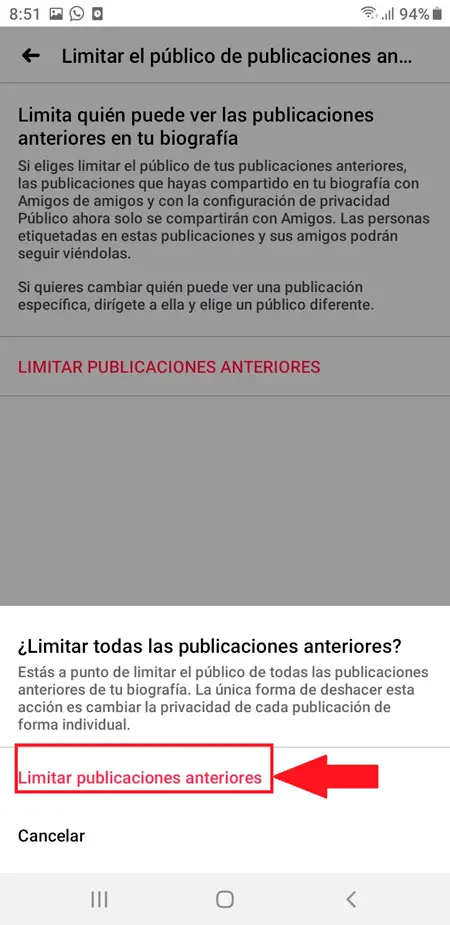- Là, vous verrez une nouvelle fenêtre où vous devez à nouveau cliquer sur «Limiter les publications précédentes» de cette manière toutes vos anciennes publications sont limitées .