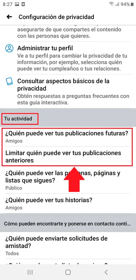 - Une fois que vous êtes dans cette fenêtre vous devez faire défiler vers le bas jusqu’à atteindre la section «Votre activité», comme vous pouvez le voir ici, plusieurs options apparaîtront, dans ce cas vous devez vous concentrer sur Qui peut voir vos futures publications? Et limitez les personnes pouvant voir vos publications précédentes.