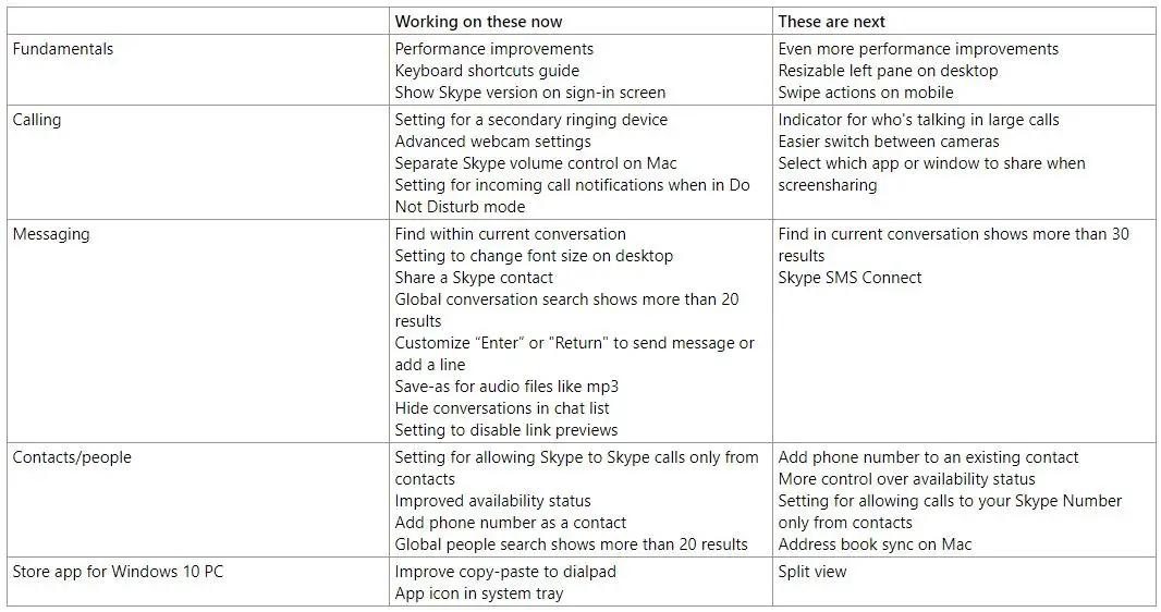 La nouvelle version de apportera un statut de disponibilité amélioré, des options pour ajouter un numéro de téléphone de contact à nos contacts et certains paramètres pour permettre de passer des appels de Skype à Skype uniquement à partir de contacts. Vous pouvez voir toutes ces nouvelles et quelques détails supplémentaires dans l’image ci-dessus où les fonctionnalités actuelles sont comparées aux nouvelles qui arriveront avec la nouvelle version.