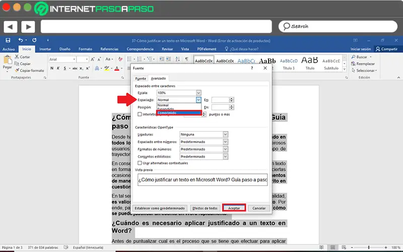 - Enfin, situé dans la section «Espacement entre caractères» , cliquez sur la sélection Espacement et choisissez l’option «Comprimé» . Il est maintenant temps de cliquer sur «OK» et ainsi, tous ces espaces seront automatiquement supprimés.