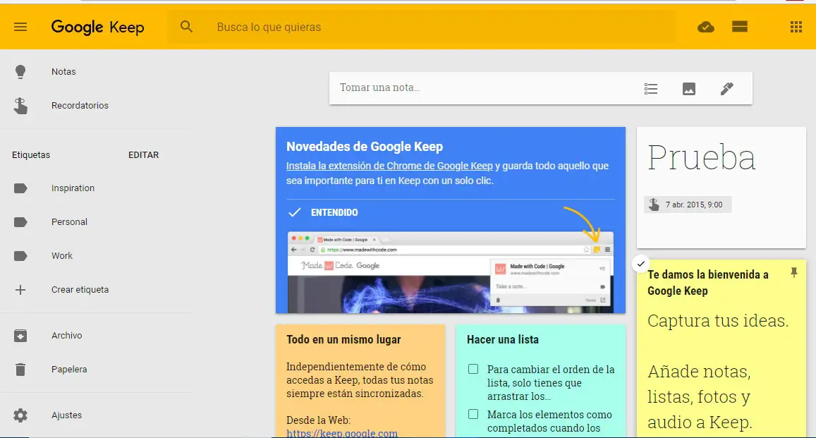 Google Keep est l’application de Google pour créer des listes de tâches et des notes. Avec En plus de pouvoir créer des listes de tâches, Google Keep offre la possibilité de créer des rappels en fonction de l’heure, de l’emplacement, de créer des listes de tâches partagées, d’envoyer des notes à Google Docs et à d’autres applications, ou même d’ajouter des notes vocales. Il est possible d’utiliser Google Keep depuis notre mobile ou depuis l’ordinateur.