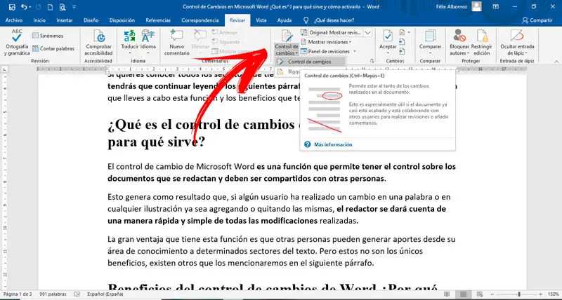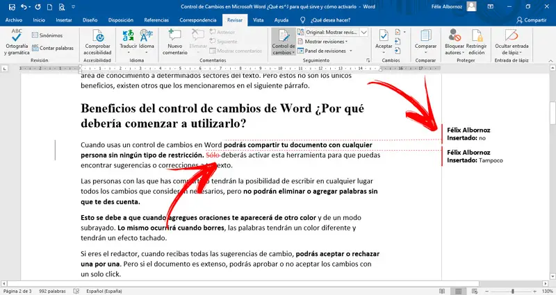 Par conséquent, lorsque vous souhaitez désactiver cet outil, vous devrez à nouveau cliquer sur «Modifier le contrôle» , car ce n’est pas une fonction comme les autres dans laquelle il se désactive automatiquement. Si vous entrez de nouveaux mots dans le texte, ils apparaîtront en rouge et soulignés . Mais lorsque vous souhaitez supprimer un ou plusieurs mots, ils ne disparaissent pas , mais vous pouvez toujours les voir en rouge et barrés .