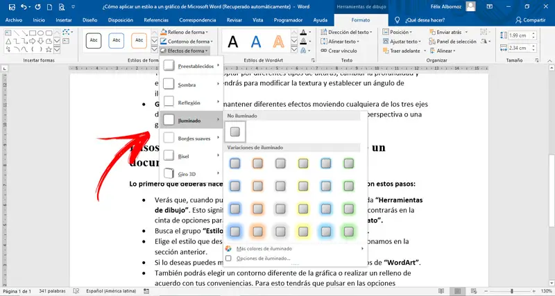 • Illuminé: si vous cherchez à générer un effet de lumière autour du graphique, vous pouvez utiliser cet outil dans lequel vous devrez choisir la couleur, la taille et la transparence.