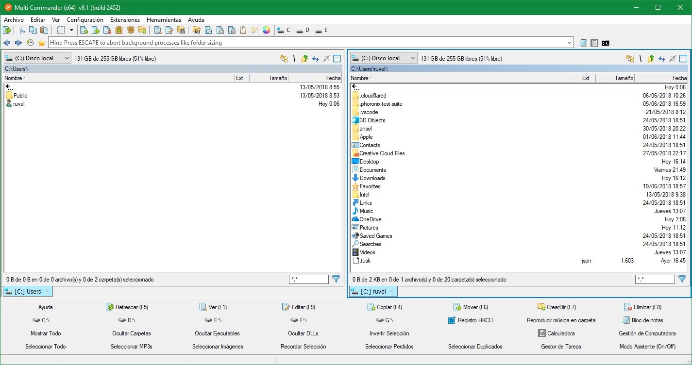 Comme nous pouvons le voir, la fenêtre principale de ce programme est divisée en deux colonnes, dans chacune desquelles nous pouvons ouvrir un dossier et pouvoir travailler avec eux en même temps (par exemple, déplacer des fichiers de l’un à l’autre). De plus, sous chaque colonne, nous pouvons également voir une barre d’ onglets, où nous pouvons avoir plusieurs dossiers ouverts en même temps, pouvant passer de l’un à l’autre très facilement.
