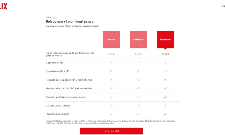 Jusqu’à présent, les abonnements Netflix étaient répartis entre l’ abonnement de base, ce qui nous permettait pour 7,99 euros par mois de voir la plateforme, sur un seul téléviseur, en SD. Pour 10,99 euros, nous pouvions voir la plate-forme sur deux écrans en même temps et, en plus, la regarder en HD et, enfin, pour 13,99 euros par mois, nous pouvions voir la plate-forme sur jusqu’à 4 téléviseurs ou appareils en même temps et , aussi, regardez-le en Ultra-HD.
