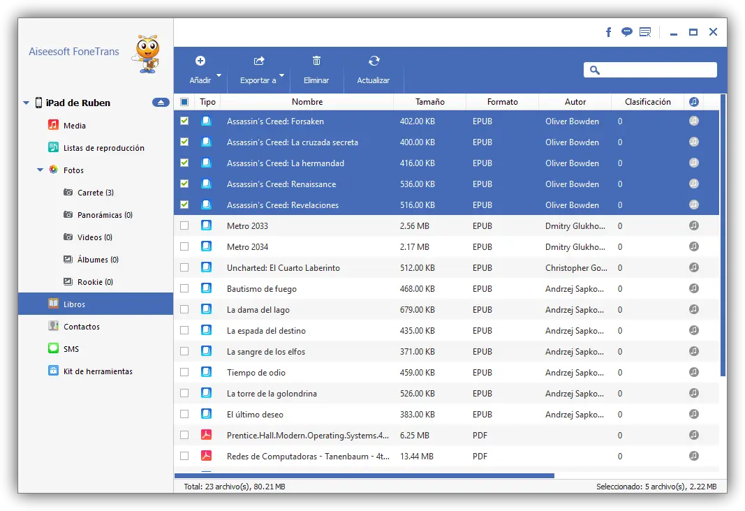 Comme on peut le voir, dans le cas où l’on souhaite exporter des livres vers le PC, le processus est le même. Nous sélectionnons, exportons et c’est tout.