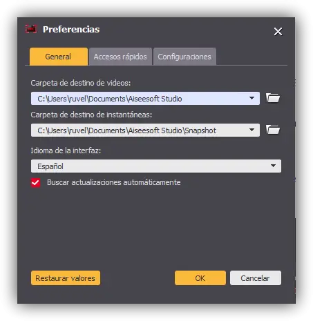 Général : De là, nous allons configurer le chemin d’enregistrement et la langue du programme.