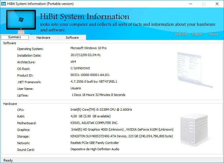 Une fois que nous avons lancé l’application, HiBit System Information commencera à collecter toutes les informations de notre ordinateur et plus tard, il nous montrera toutes dans son interface organisée par onglets. Dans l’onglet récapitulatif, nous pouvons voir des informations générales sur notre ordinateur, processeur, carte graphique, disque dur, carte réseau et certains détails logiciels, tels que la version du système d’exploitation installé sur l’ordinateur ou son architecture, etc.