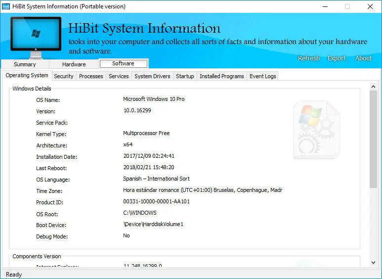 Sous l’onglet Logiciel, nous trouverons également des informations importantes sur les composants logiciels de notre ordinateur, des détails sur le système d’exploitation installé, les processus et services en cours d’exécution, les programmes installés, les détails de sécurité, etc.