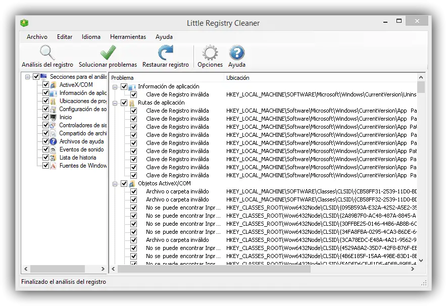 Ce programme nous permettra d’effectuer une analyse de la base de données Windows complète ou de ne revoir qu’une catégorie spécifique. Le programme l’analysera, nous montrera les défauts et, lorsqu’il s’agira de les résoudre, créera une sauvegarde temporaire en cas de problème pendant le processus de nettoyage.
