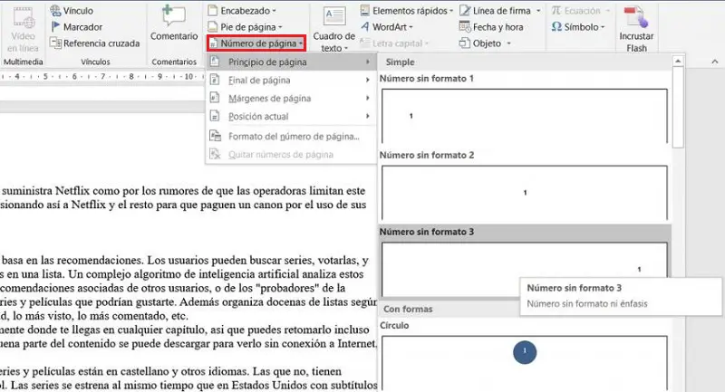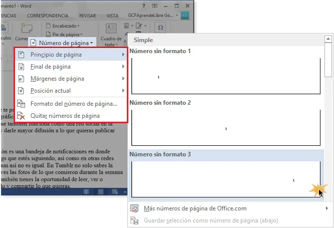 - Une fois le design choisi, vous devez savoir que cela commencera à compter à partir du numéro de page réel dans le document, donc il ne commencera pas à 1 mais à la page 3 ou 4 selon le cas.