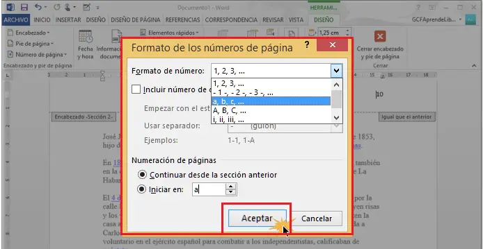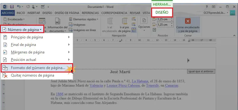 - Si nous voulons que cela commence à 1, nous devons cliquer sur le numéro et aller dans «Conception»> «Numéro de page»> «Format de page» et suivre les instructions.