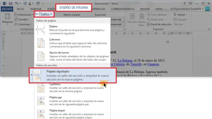 - Nous entrons dans l’onglet «Conception de page» et cliquons sur «Sauts», là nous devons sélectionner «Page suivante».