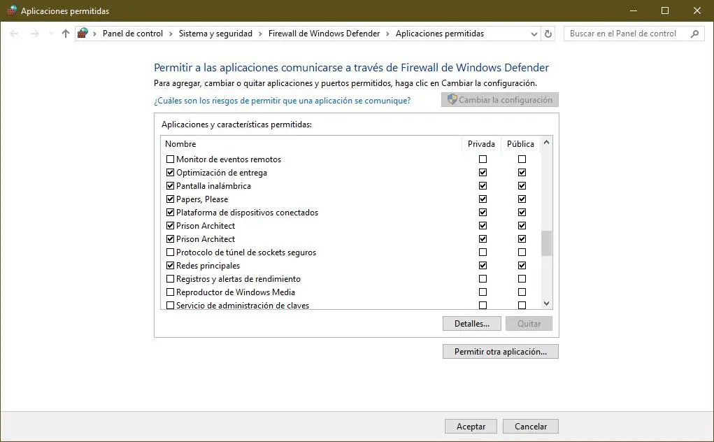 Nous sélectionnons cette option et une nouvelle fenêtre de configuration du pare-feu Windows s’ouvrira où nous verrons une liste de toutes les applications que nous avons installées sur notre ordinateur, ainsi que des cases où nous pouvons vérifier si nous voulons ou non que ladite application puisse pour se connecter à Internet via des réseaux privés et publics.