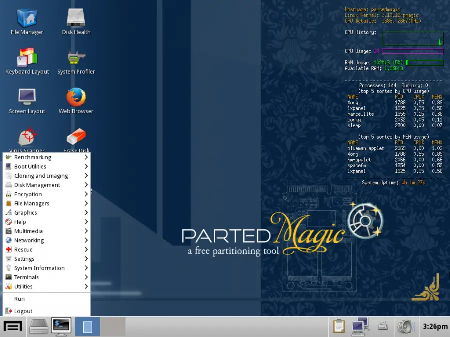Comme Ubuntu 12.10, Ubuntu 13.04 et Clonezilla, Parted Magic s’adapte aux nouveaux ordinateurs permettant un démarrage sécurisé UEFI sur eux pour pouvoir gérer les disques durs si nécessaire. Cet outil logiciel gratuit est l’une des meilleures options gratuites lorsqu’il s’agit de vérifier les partitions ou les disques durs, car tous les logiciels sont installés et prêts à être utilisés, simplifiant au maximum son utilisation.