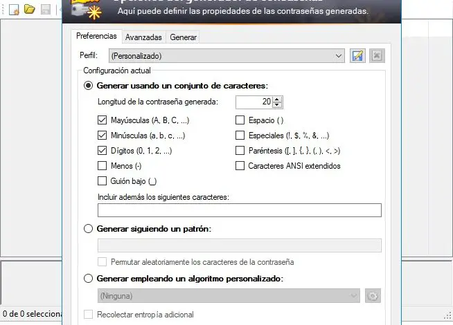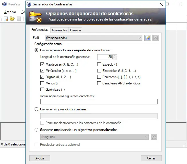 Les options que nous marquons ou non seront directement liées au niveau de complexité , et donc de sécurité, des mots de passe que le programme générera à chaque fois que nous le demanderons. En même temps, l’ outil lui-même dispose d’une fonction qui nous permet de générer des mots de passe suivant un modèle, voire au moyen d’un algorithme personnalisé.