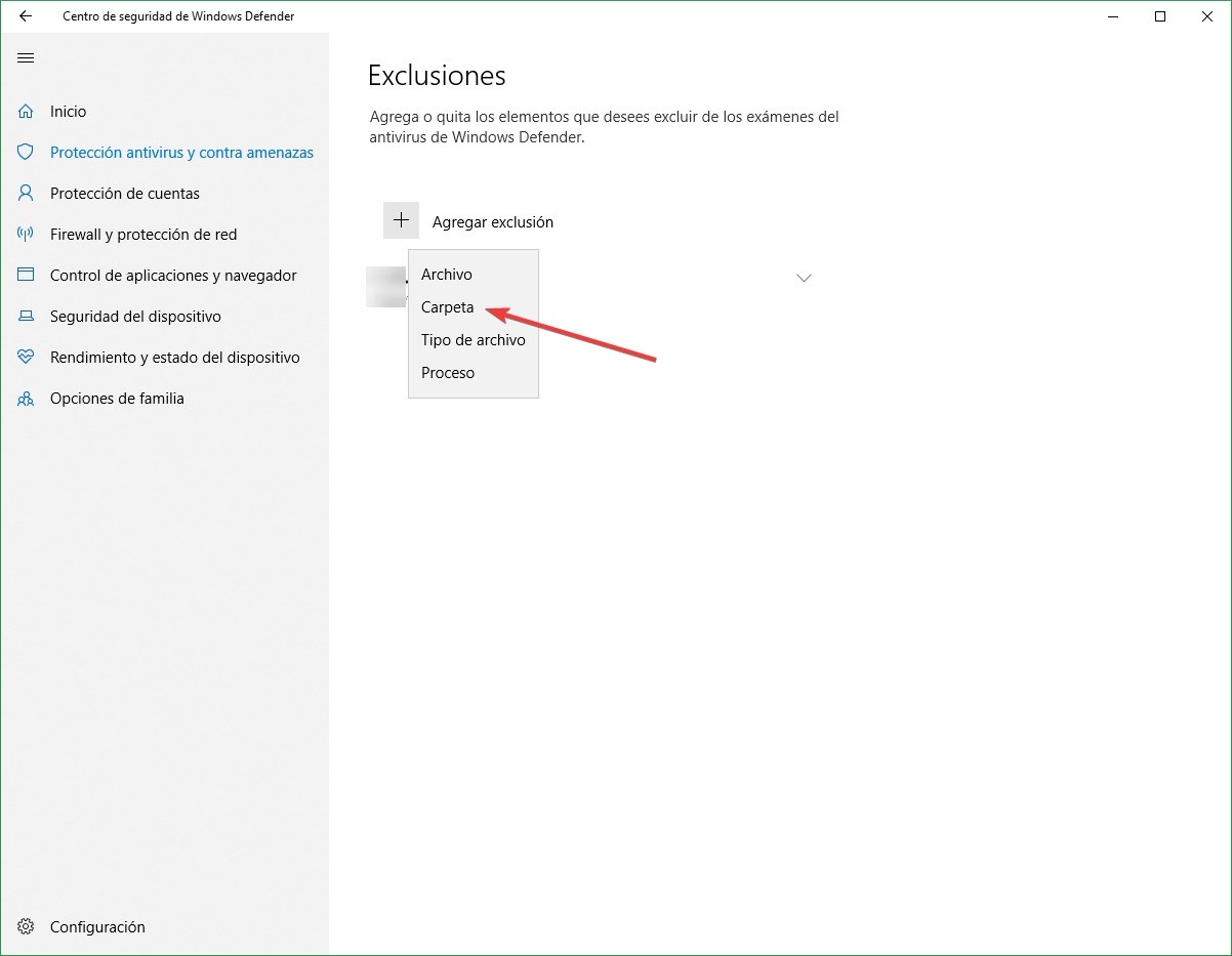 Dans le menu qui apparaît, nous allons passer à la section «Exclusions» pour ajouter le dossier iCloud à la liste blanche de cet antivirus. Nous ajouterons un nouveau dossier à partir du bouton «+» en sélectionnant le répertoire dans lequel iCloud est installé, ou directement tout le dossier Apple qui, par défaut, se trouvera dans «Program Files».