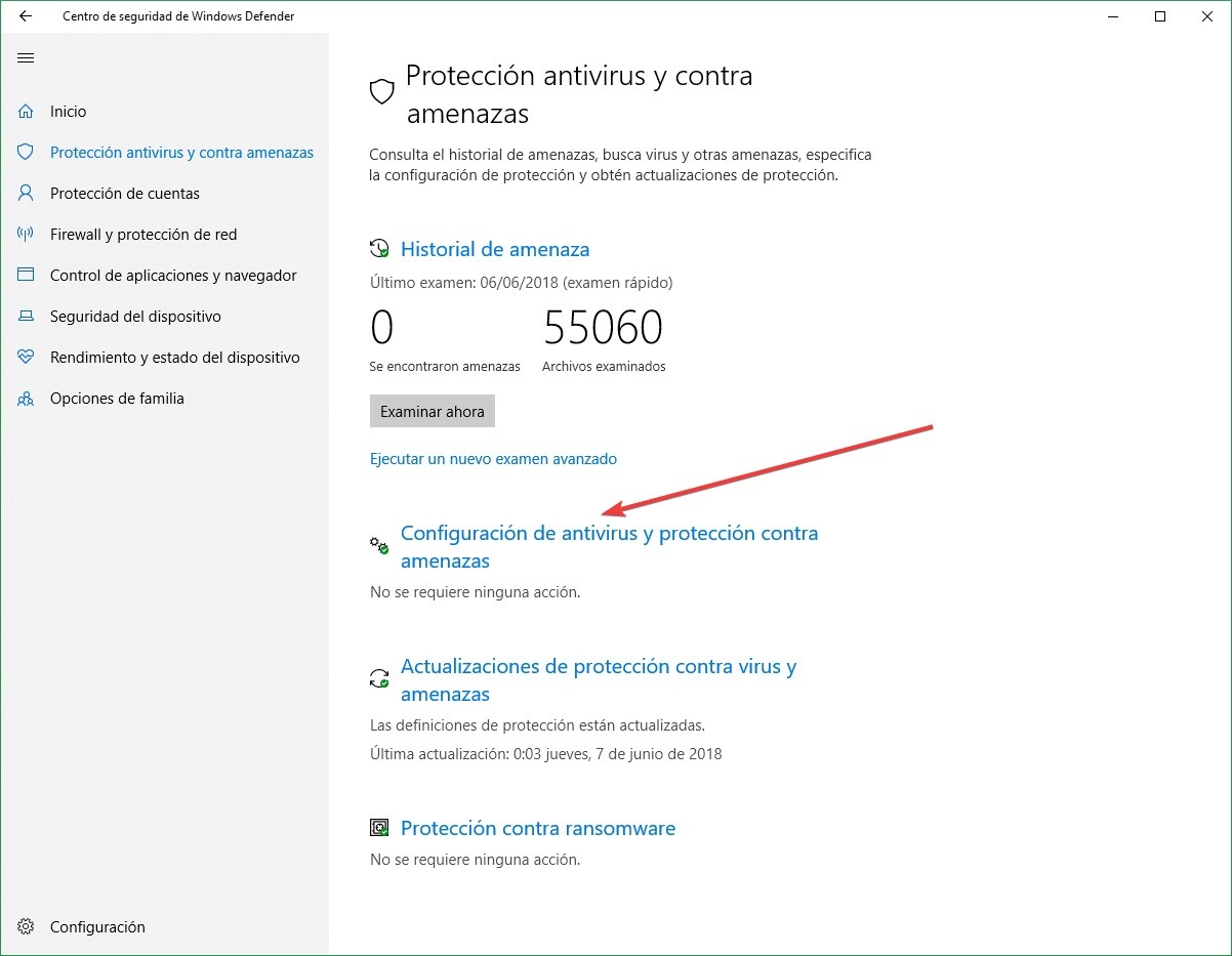 Pour résoudre les problèmes de connexion iCloud sous Windows 10, il suffit en gros de créer une règle dans l’antivirus qui ignore ledit fichier suspect et autorise sa connexion. Pour ce faire, nous allons ouvrir la fenêtre Windows Defender et entrer dans la section » Protection contre les virus et les menaces » et entrer dans la section Paramètres.